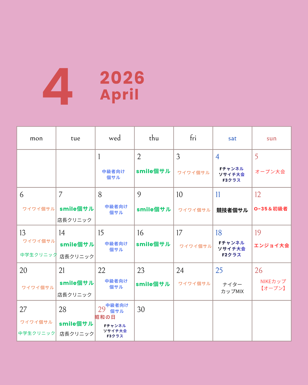 【春からフットサル、始めませんか?】 4月になり、新しいことを始めたくなる季節ですね! 「運動不足を解消したい」「フットサルに興味があるけど、自信がない…」 そんな方にぴったりのプログラムが今月も充実しています。 初めての方にオススメのクラス * 月曜・金曜:初級者&女性向け個サル スタッフが丁寧にサポートするので、女性やお一人様、未経験の方も安心してご参加いただけます! * 火曜・木曜:ゆる個サル その名の通り「ゆる〜く」楽しむのがモットー。勝敗よりも楽しく体を動かしたい方に最適です。 スキルアップしたい方へ * 毎週火曜:店長クリニック 初心者の方も大歓迎!ボールの蹴り方から優しくレクチャーします。 新しい環境でのリフレッシュや、新しい仲間作りにフットサルは最高です。 まずは1回、ピッチの雰囲気を覗きに来てみてください!笑い声の絶えない時間をご一緒しましょう!